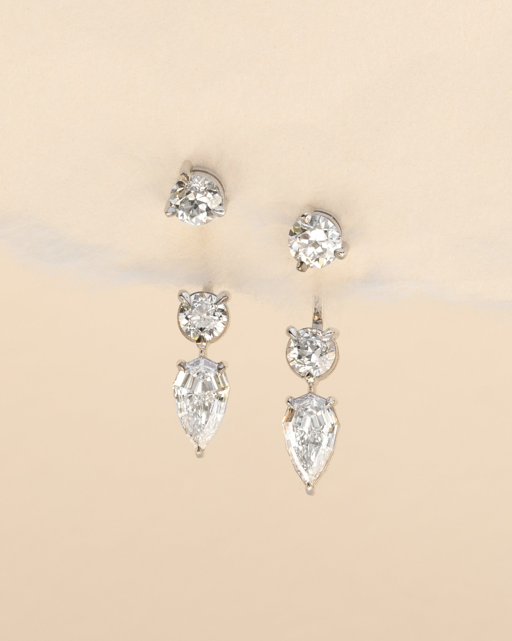 The Floating Step-Cut Pear Diamond Earrings - a refined balance of edge and elegance.  Set with  4ct of incredibly special old European round diamonds and geo step-cut pear shape diamonds. Earrings designed to honor the unique characteristics of these stunning diamonds.