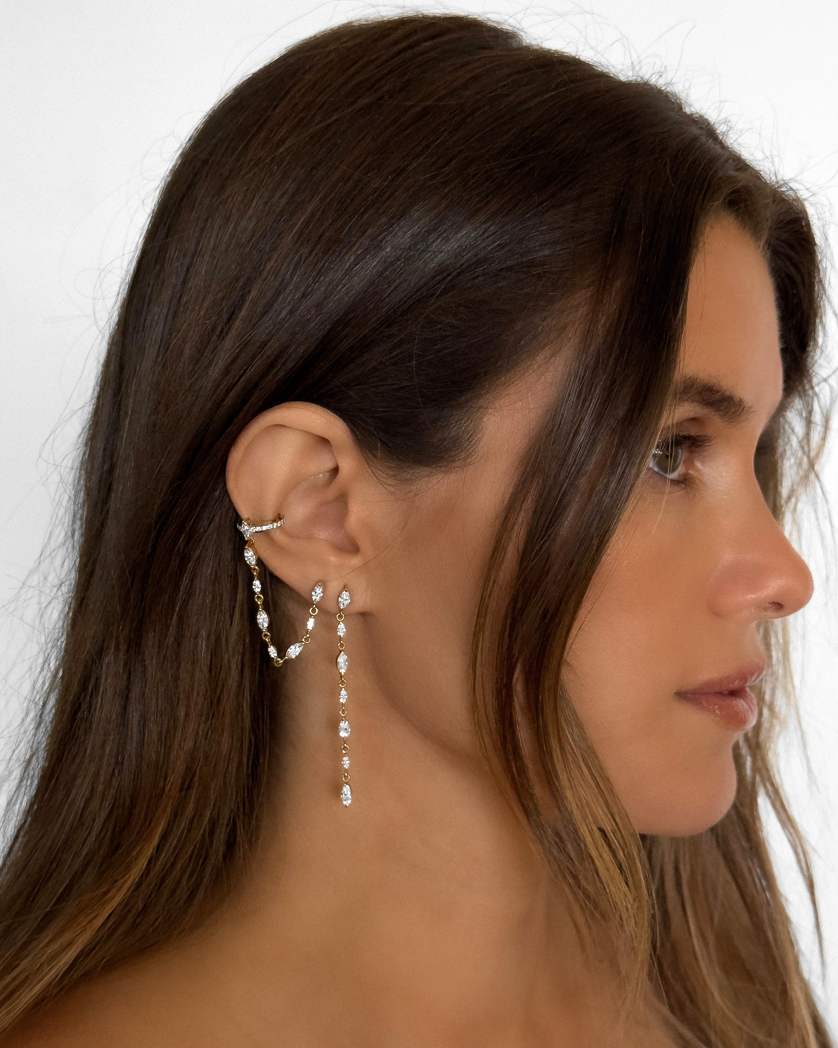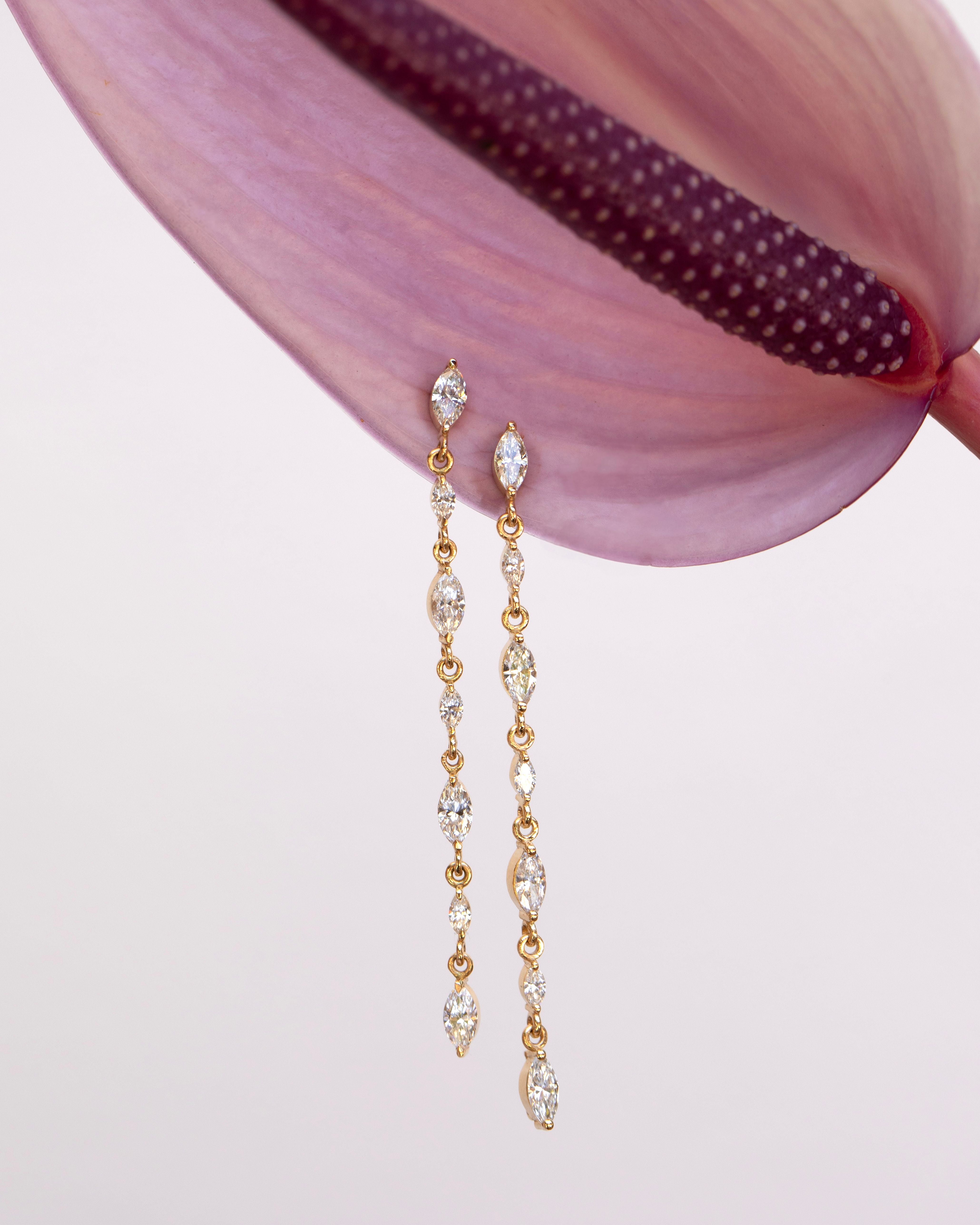 A fluid strand of marquise diamonds set delicately in a refined 18k setting to showcase the simple beauty of these stones. Designed to move with the wearer, they catch the light with every step, creating a soft shimmer that feels both effortless and intentional. Pair with the Marquise Ear Cuff for a sculptural ear moment that feels both striking and timeless