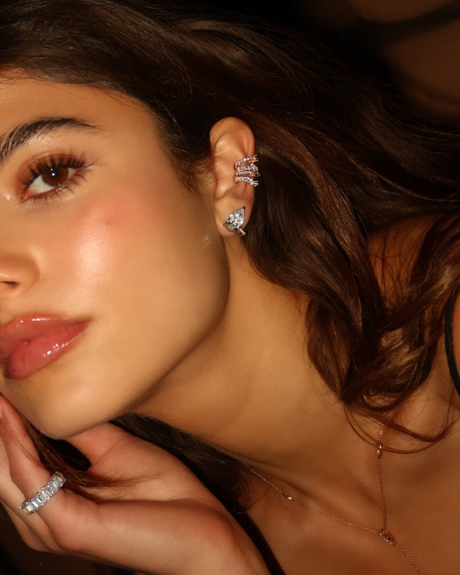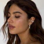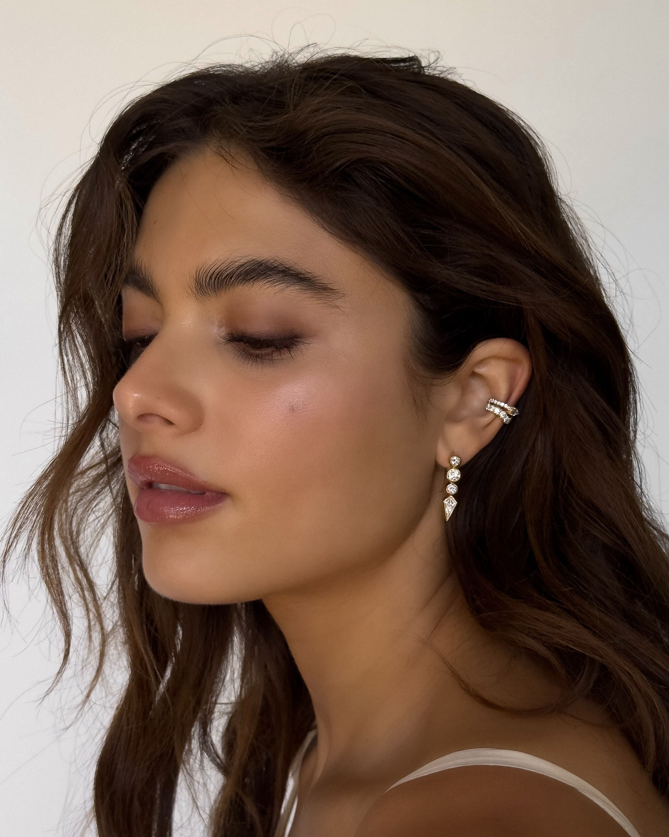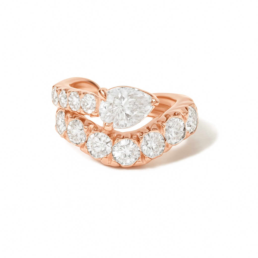 The Wavy Ear Cuff—fluid elegance that follows your ear's natural curve. Two rows of diamonds in contrasting sizes create captivating movement and draw the eye to the soft sculpted contours. A pear cut diamond nestles perfectly within the curves, completing this effortlessly chic statement piece that's both bold and beautifully balanced.
