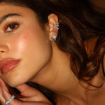 The Wavy Ear Cuff—fluid elegance that follows your ear's natural curve. Two rows of diamonds in contrasting sizes create captivating movement and draw the eye to the soft sculpted contours. A pear cut diamond nestles perfectly within the curves, completing this effortlessly chic statement piece that's both bold and beautifully balanced.