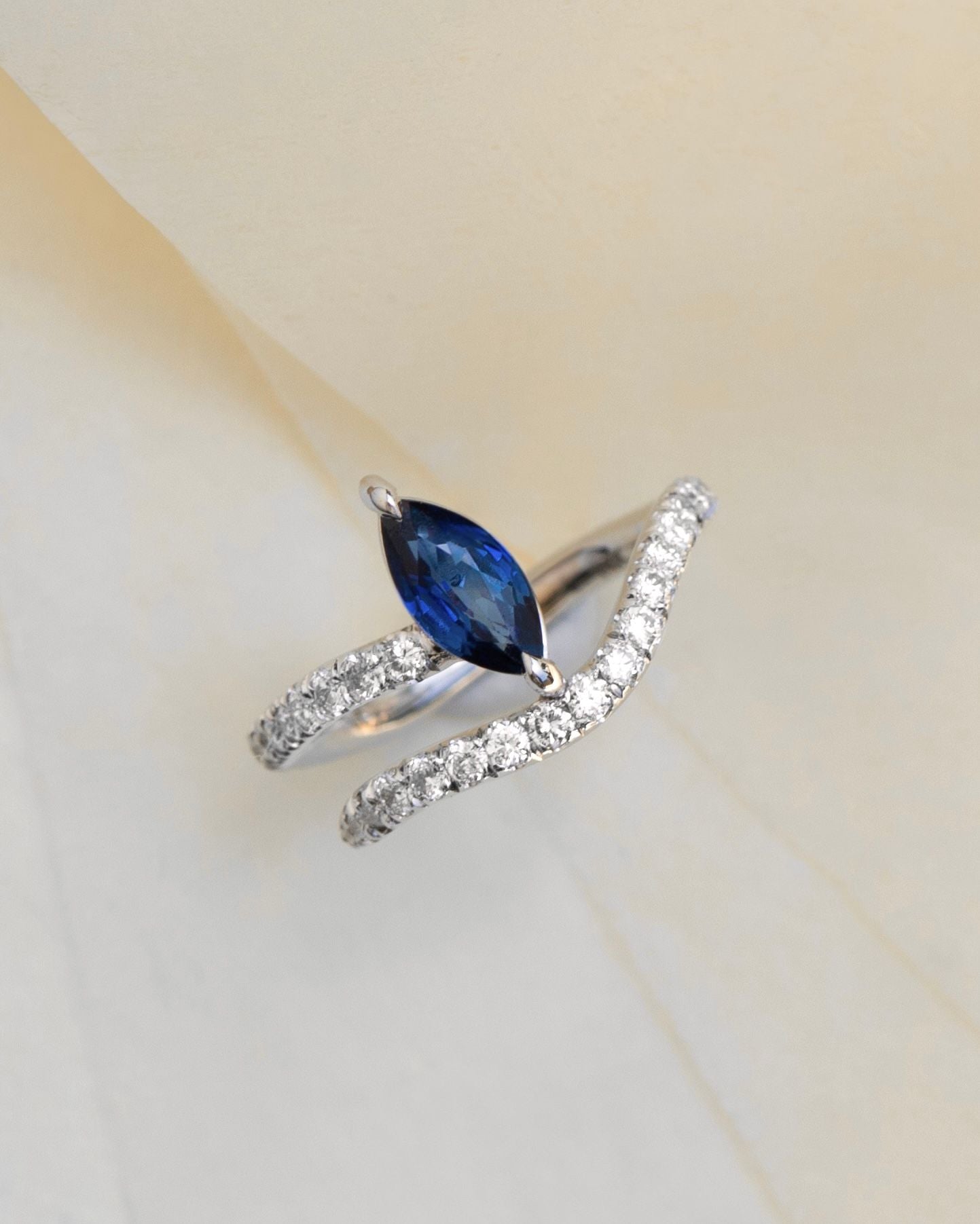 The Wavy Spiral Pinky Ring—where architectural design meets mariquise diamond brilliance. The precise spiral flows around your finger, centered by a striking .50ct marquise blue sapphire. A versatile statement piece that elevates any style with sophisticated color.