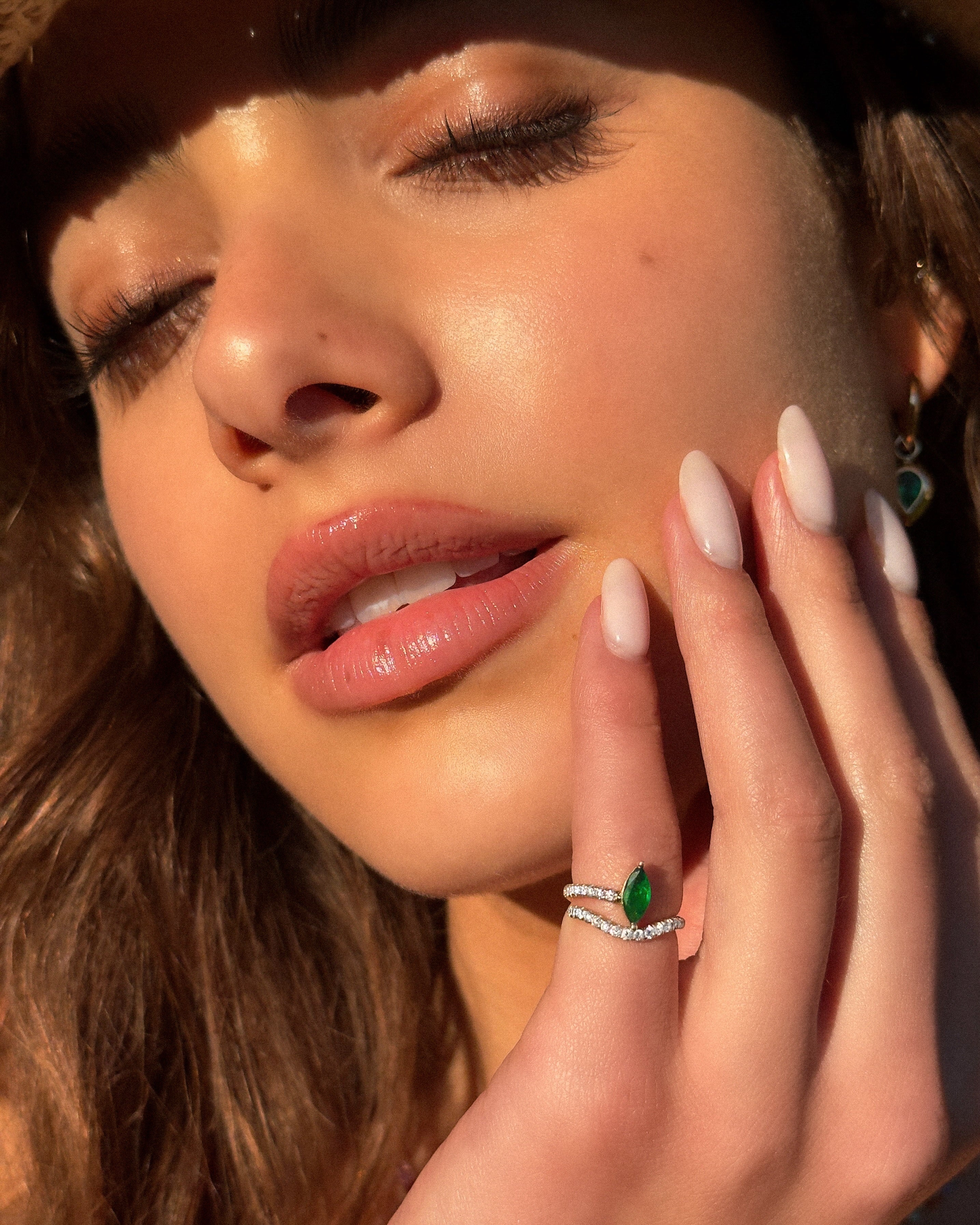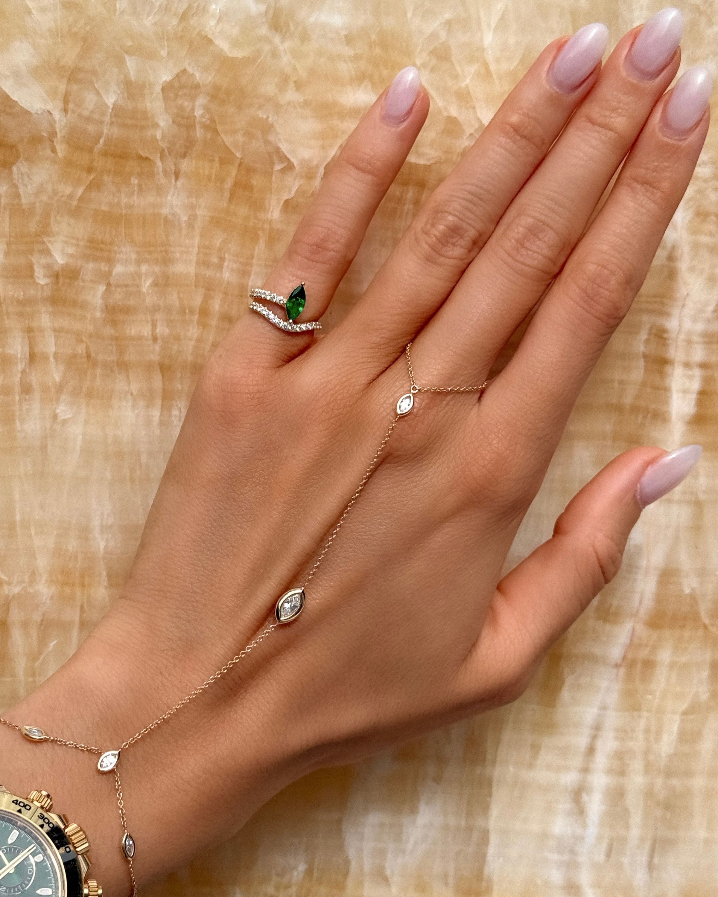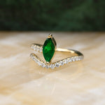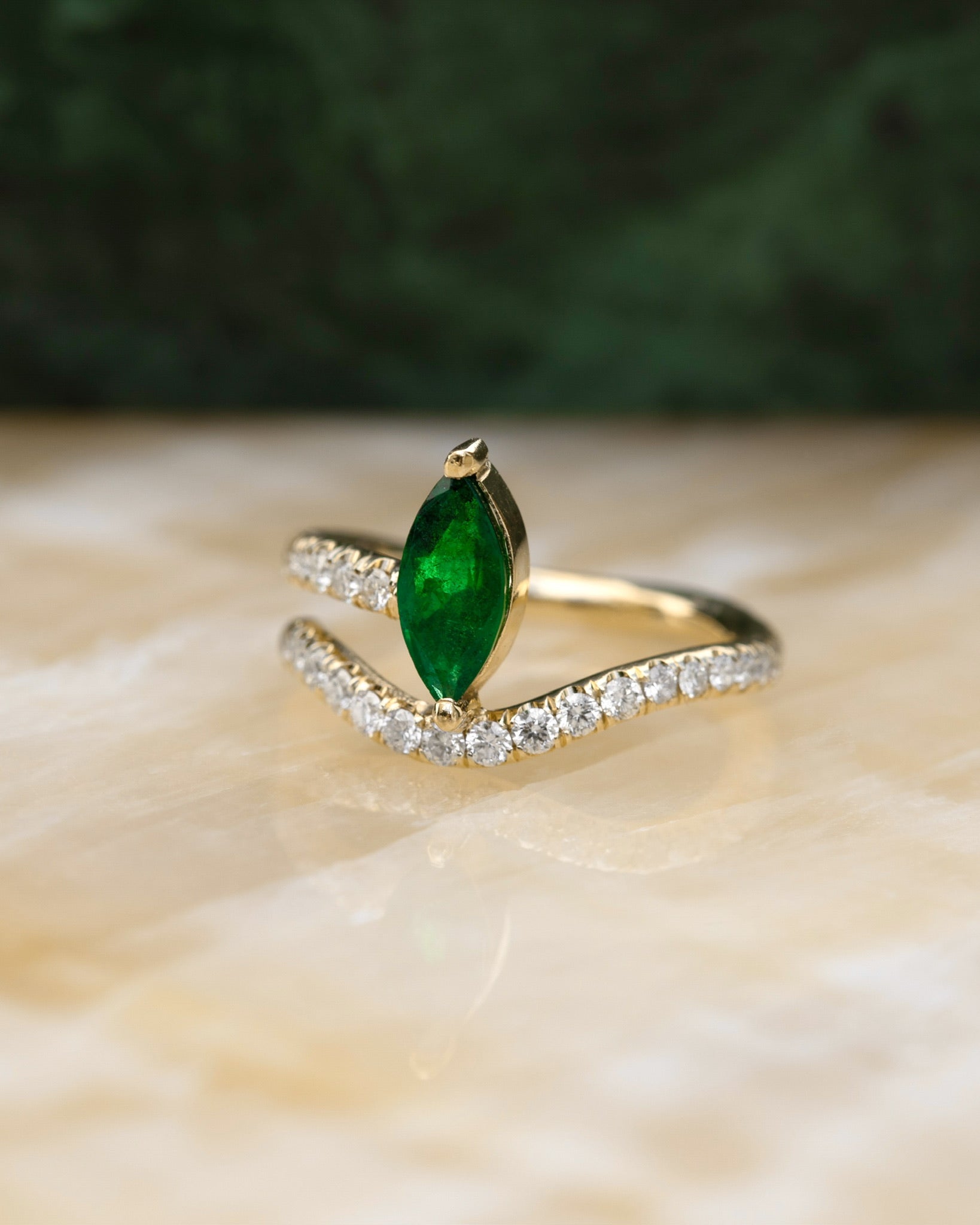 The pave-set wavy ring features gentle curves that elegantly surround the marquise-cut emerald, offerings a refined touch of color that is both timeless and sophisticated.