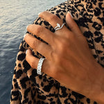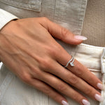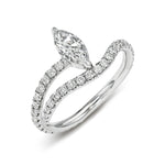 The pave-set wavy ring features gentle curves that elegantly surround the .50ct marquise-cut diamond, offerings a refined touch of color that is both timeless and sophisticated.