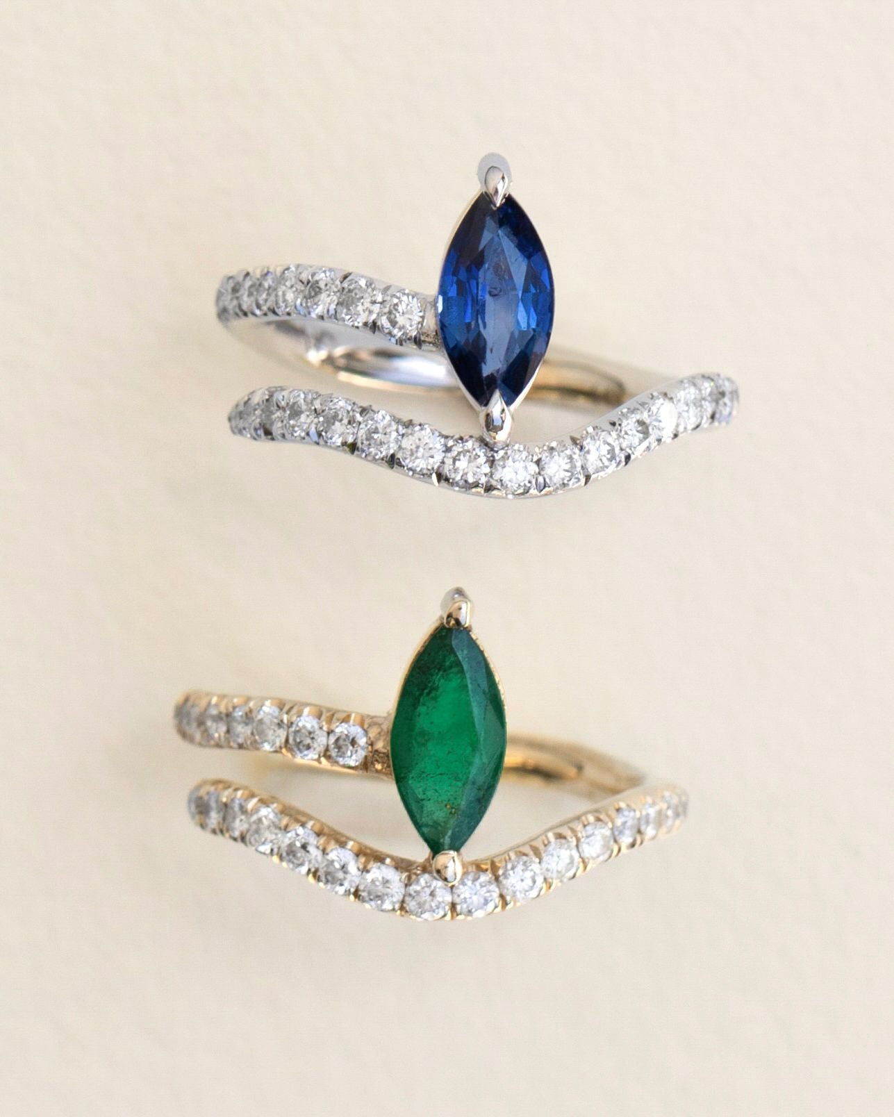 The pave-set wavy ring features gentle curves framed in .50ct of brilliant cut round diamonds that elegantly surround the .50ct marquise-cut diamond, offerings a refined touch of color that is both timeless and sophisticated.